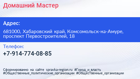 Домашний Мастер по адресу 681000, Хабаровский край, Комсомольск-на-Амуре, проспект Первостроителей, 18 в дальнейшем Организация, размещена в следующих категориях: