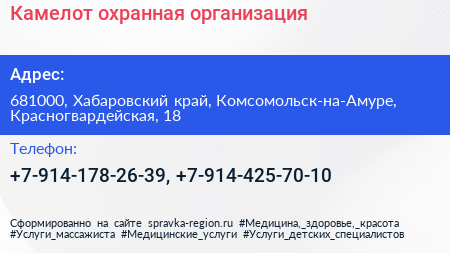 Камелот, охранная организация по адресу 681000, Хабаровский край, Комсомольск-на-Амуре, Красногвардейская, 18 в дальнейшем Организация, размещена в следующих категориях: