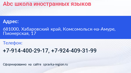 Abc, школа иностранных языков по адресу 681000, Хабаровский край, Комсомольск-на-Амуре, Пионерская, 17 в дальнейшем Организация, размещена в следующих категориях: