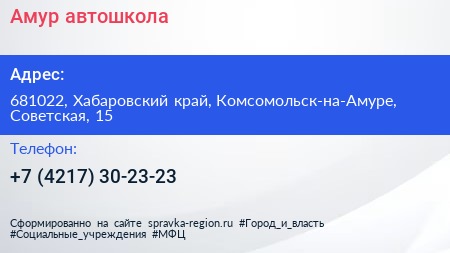 Амур, автошкола по адресу 681022, Хабаровский край, Комсомольск-на-Амуре, Советская, 15 в дальнейшем Организация, размещена в следующих категориях: