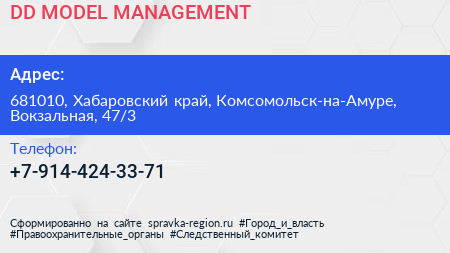 DD MODEL MANAGEMENT по адресу 681010, Хабаровский край, Комсомольск-на-Амуре, Вокзальная, 47/3 в дальнейшем Организация, размещена в следующих категориях: