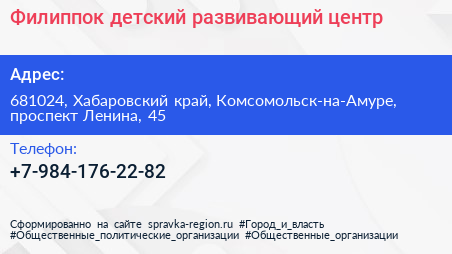 Филиппок, детский развивающий центр по адресу 681024, Хабаровский край, Комсомольск-на-Амуре, проспект Ленина, 45 в дальнейшем Организация, размещена в следующих категориях: