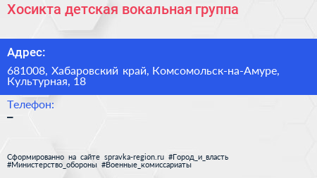 Хосикта, детская вокальная группа по адресу 681008, Хабаровский край, Комсомольск-на-Амуре, Культурная, 18 в дальнейшем Организация, размещена в следующих категориях: