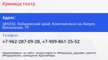 Криница, театр по адресу 681032, Хабаровский край, Комсомольск-на-Амуре, Вокзальная, 79 в дальнейшем Организация, размещена в следующих категориях: