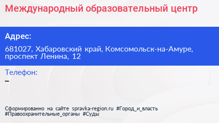 Международный образовательный центр по адресу 681027, Хабаровский край, Комсомольск-на-Амуре, проспект Ленина, 12 в дальнейшем Организация, размещена в следующих категориях:
