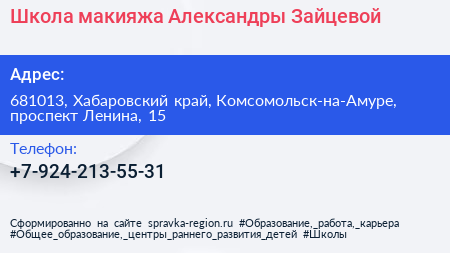 Школа макияжа Александры Зайцевой по адресу 681013, Хабаровский край, Комсомольск-на-Амуре, проспект Ленина, 15 в дальнейшем Организация, размещена в следующих категориях: