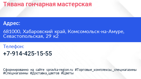 Тявана, гончарная мастерская по адресу 681000, Хабаровский край, Комсомольск-на-Амуре, Севастопольская, 29 к2 в дальнейшем Организация, размещена в следующих категориях: