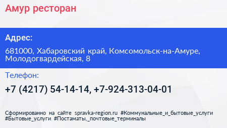 Амур, ресторан по адресу 681000, Хабаровский край, Комсомольск-на-Амуре, Молодогвардейская, 8 в дальнейшем Организация, размещена в следующих категориях: