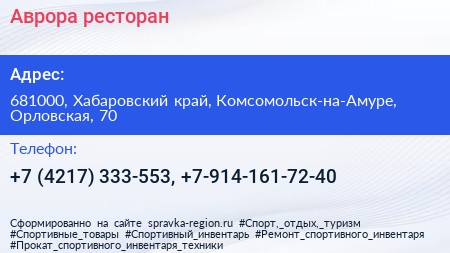 Аврора, ресторан по адресу 681000, Хабаровский край, Комсомольск-на-Амуре, Орловская, 70 в дальнейшем Организация, размещена в следующих категориях: