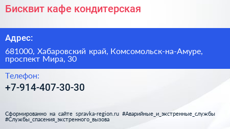 Бисквит, кафе-кондитерская по адресу 681000, Хабаровский край, Комсомольск-на-Амуре, проспект Мира, 30 в дальнейшем Организация, размещена в следующих категориях: