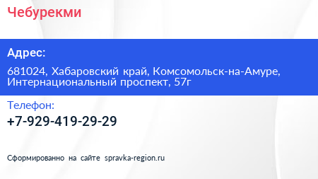 Чебурекми по адресу 681024, Хабаровский край, Комсомольск-на-Амуре, Интернациональный проспект, 57г в дальнейшем Организация, размещена в следующих категориях: