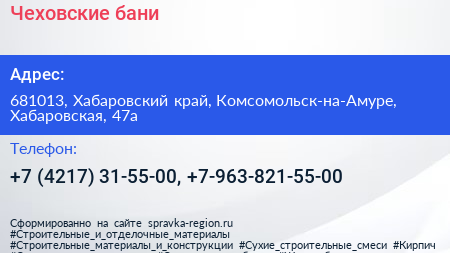 Чеховские бани по адресу 681013, Хабаровский край, Комсомольск-на-Амуре, Хабаровская, 47а в дальнейшем Организация, размещена в следующих категориях:
