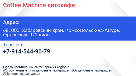 Coffee Machine, автокафе по адресу 681000, Хабаровский край, Комсомольск-на-Амуре, Орловская, 1/2 киоск в дальнейшем Организация, размещена в следующих категориях: