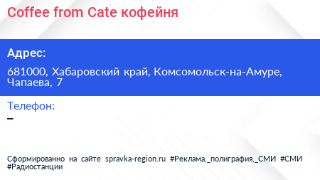 Coffee from Cate, кофейня по адресу 681000, Хабаровский край, Комсомольск-на-Амуре, Чапаева, 7 в дальнейшем Организация, размещена в следующих категориях: