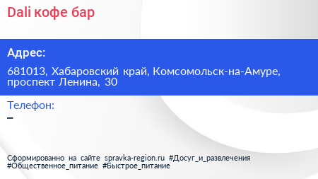Dali, кофе-бар по адресу 681013, Хабаровский край, Комсомольск-на-Амуре, проспект Ленина, 30 в дальнейшем Организация, размещена в следующих категориях: