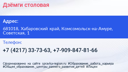 Дзёмги, столовая по адресу 681018, Хабаровский край, Комсомольск-на-Амуре, Советская, 1 в дальнейшем Организация, размещена в следующих категориях: