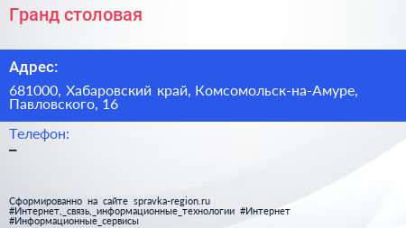 Гранд, столовая по адресу 681000, Хабаровский край, Комсомольск-на-Амуре, Павловского, 16 в дальнейшем Организация, размещена в следующих категориях: