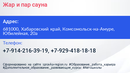 Жар и пар, сауна по адресу 681000, Хабаровский край, Комсомольск-на-Амуре, Юбилейная, 20а в дальнейшем Организация, размещена в следующих категориях: