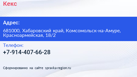 Кекс по адресу 681000, Хабаровский край, Комсомольск-на-Амуре, Красноармейская, 18/2 в дальнейшем Организация, размещена в следующих категориях: