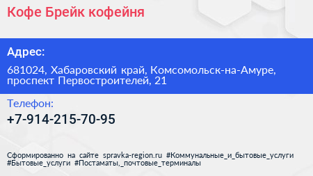 Кофе Брейк, кофейня по адресу 681024, Хабаровский край, Комсомольск-на-Амуре, проспект Первостроителей, 21 в дальнейшем Организация, размещена в следующих категориях: