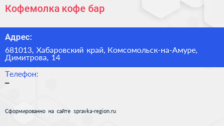 Кофемолка, кофе-бар по адресу 681013, Хабаровский край, Комсомольск-на-Амуре, Димитрова, 14 в дальнейшем Организация, размещена в следующих категориях: