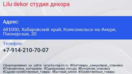 Lilu dekor, студия декора по адресу 681000, Хабаровский край, Комсомольск-на-Амуре, Пионерская, 20 в дальнейшем Организация, размещена в следующих категориях: