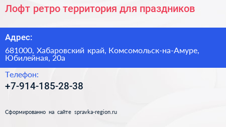 Лофт-ретро, территория для праздников по адресу 681000, Хабаровский край, Комсомольск-на-Амуре, Юбилейная, 20а в дальнейшем Организация, размещена в следующих категориях: