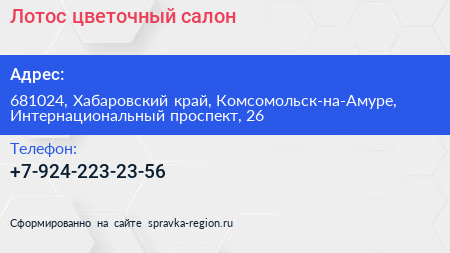 Лотос, цветочный салон по адресу 681024, Хабаровский край, Комсомольск-на-Амуре, Интернациональный проспект, 26 в дальнейшем Организация, размещена в следующих категориях: