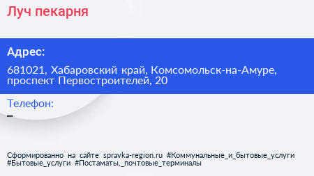 Луч, пекарня по адресу 681021, Хабаровский край, Комсомольск-на-Амуре, проспект Первостроителей, 20 в дальнейшем Организация, размещена в следующих категориях:
