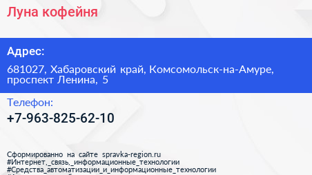 Луна, кофейня по адресу 681027, Хабаровский край, Комсомольск-на-Амуре, проспект Ленина, 5 в дальнейшем Организация, размещена в следующих категориях: