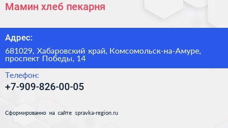 Мамин хлеб, пекарня по адресу 681029, Хабаровский край, Комсомольск-на-Амуре, проспект Победы, 14 в дальнейшем Организация, размещена в следующих категориях: