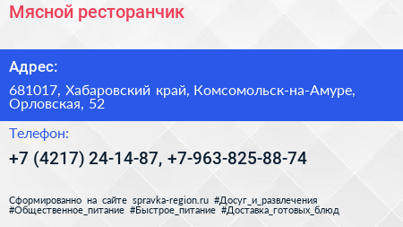 Мясной ресторанчик по адресу 681017, Хабаровский край, Комсомольск-на-Амуре, Орловская, 52 в дальнейшем Организация, размещена в следующих категориях: