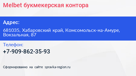 Melbet, букмекерская контора по адресу 681035, Хабаровский край, Комсомольск-на-Амуре, Вокзальная, 87 в дальнейшем Организация, размещена в следующих категориях: