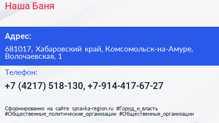 Наша Баня по адресу 681017, Хабаровский край, Комсомольск-на-Амуре, Волочаевская, 1 в дальнейшем Организация, размещена в следующих категориях: