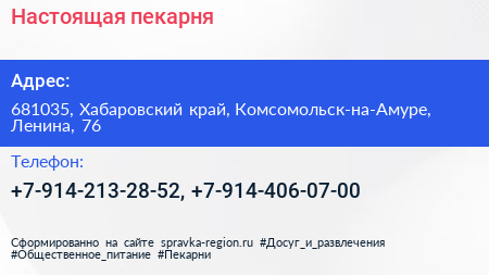 Настоящая пекарня по адресу 681035, Хабаровский край, Комсомольск-на-Амуре, Ленина, 76 в дальнейшем Организация, размещена в следующих категориях: