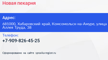 Новая пекарня по адресу 681000, Хабаровский край, Комсомольск-на-Амуре, улица Аллея Труда, 38 в дальнейшем Организация, размещена в следующих категориях: