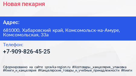 Новая пекарня по адресу 681000, Хабаровский край, Комсомольск-на-Амуре, Комсомольская, 33а в дальнейшем Организация, размещена в следующих категориях: