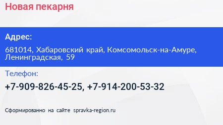 Новая пекарня по адресу 681014, Хабаровский край, Комсомольск-на-Амуре, Ленинградская, 59 в дальнейшем Организация, размещена в следующих категориях: