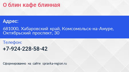 О, блин, кафе-блинная по адресу 681000, Хабаровский край, Комсомольск-на-Амуре, Октябрьский проспект, 30 в дальнейшем Организация, размещена в следующих категориях: