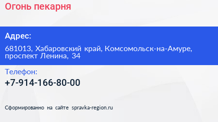 Огонь, пекарня по адресу 681013, Хабаровский край, Комсомольск-на-Амуре, проспект Ленина, 34 в дальнейшем Организация, размещена в следующих категориях:
