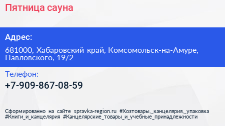 Пятница, сауна по адресу 681000, Хабаровский край, Комсомольск-на-Амуре, Павловского, 19/2 в дальнейшем Организация, размещена в следующих категориях: