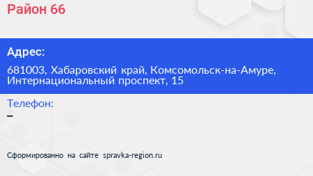 Район 66 по адресу 681003, Хабаровский край, Комсомольск-на-Амуре, Интернациональный проспект, 15 в дальнейшем Организация, размещена в следующих категориях:
