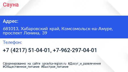 Сауна по адресу 681013, Хабаровский край, Комсомольск-на-Амуре, проспект Ленина, 39 в дальнейшем Организация, размещена в следующих категориях: