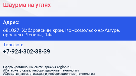 Шаурма на углях по адресу 681027, Хабаровский край, Комсомольск-на-Амуре, проспект Ленина, 14а в дальнейшем Организация, размещена в следующих категориях:
