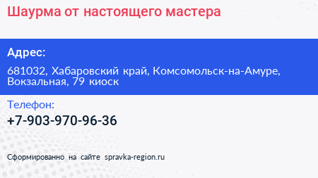 Шаурма от настоящего мастера по адресу 681032, Хабаровский край, Комсомольск-на-Амуре, Вокзальная, 79 киоск в дальнейшем Организация, размещена в следующих категориях: