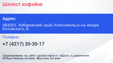 Шелест, кофейня по адресу 681021, Хабаровский край, Комсомольск-на-Амуре, Котовского, 8 в дальнейшем Организация, размещена в следующих категориях:
