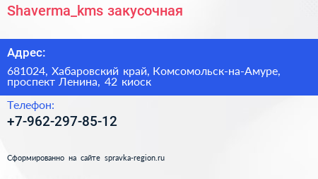 Shaverma_kms, закусочная по адресу 681024, Хабаровский край, Комсомольск-на-Амуре, проспект Ленина, 42 киоск в дальнейшем Организация, размещена в следующих категориях: