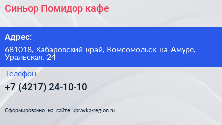 Синьор Помидор, кафе по адресу 681018, Хабаровский край, Комсомольск-на-Амуре, Уральская, 24 в дальнейшем Организация, размещена в следующих категориях: