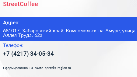 StreetCoffee по адресу 681017, Хабаровский край, Комсомольск-на-Амуре, улица Аллея Труда, 62а в дальнейшем Организация, размещена в следующих категориях: