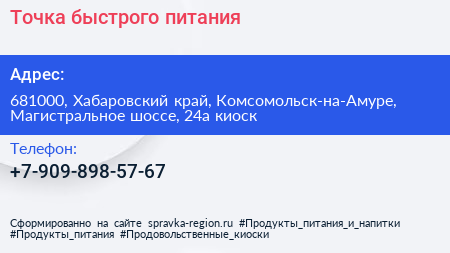 Точка быстрого питания по адресу 681000, Хабаровский край, Комсомольск-на-Амуре, Магистральное шоссе, 24а киоск в дальнейшем Организация, размещена в следующих категориях: